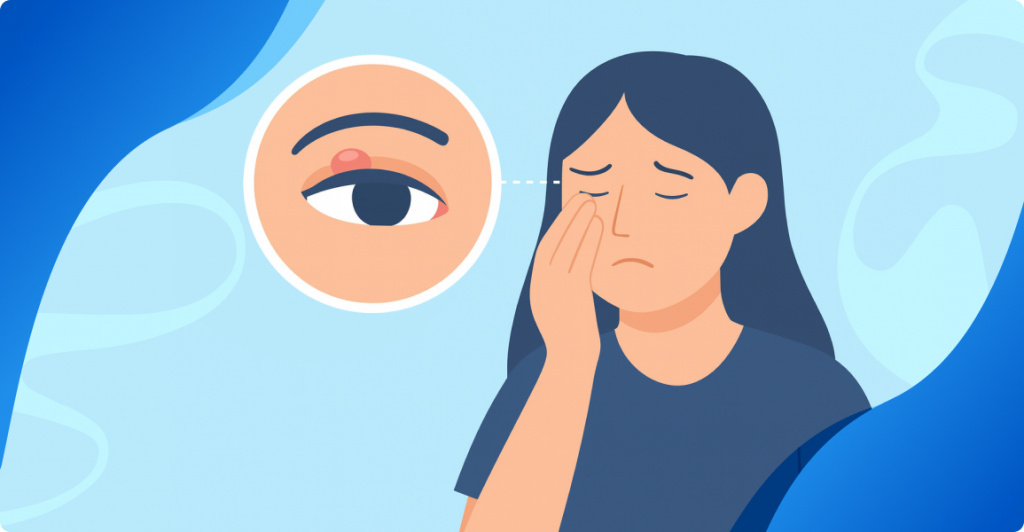 Ячмень на веке — это острое гнойное воспаление волосяного мешочка ресницы или сальной железы. Появляется болезненная «шишка», отек, боль при нажатии на глаз и при касании века. Моргание усиливает дискомфорт, потому что опухшее веко давит на роговицу.