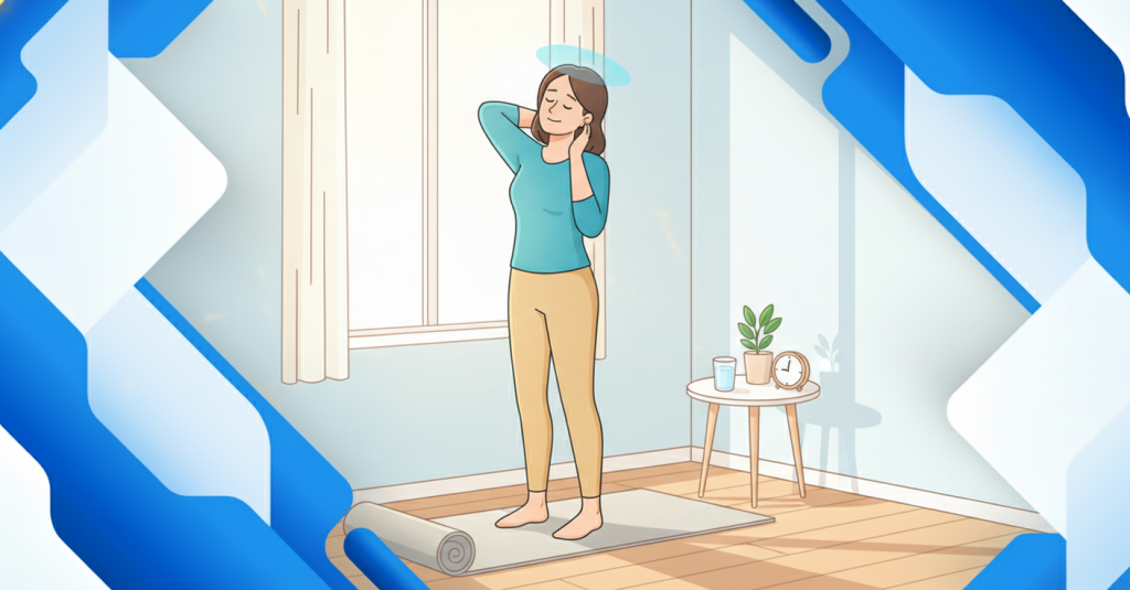 Лёгкая растяжка шеи: медленные наклоны и повороты головы, мягкие круговые движения плечами. Без резких движений, без хрустения.